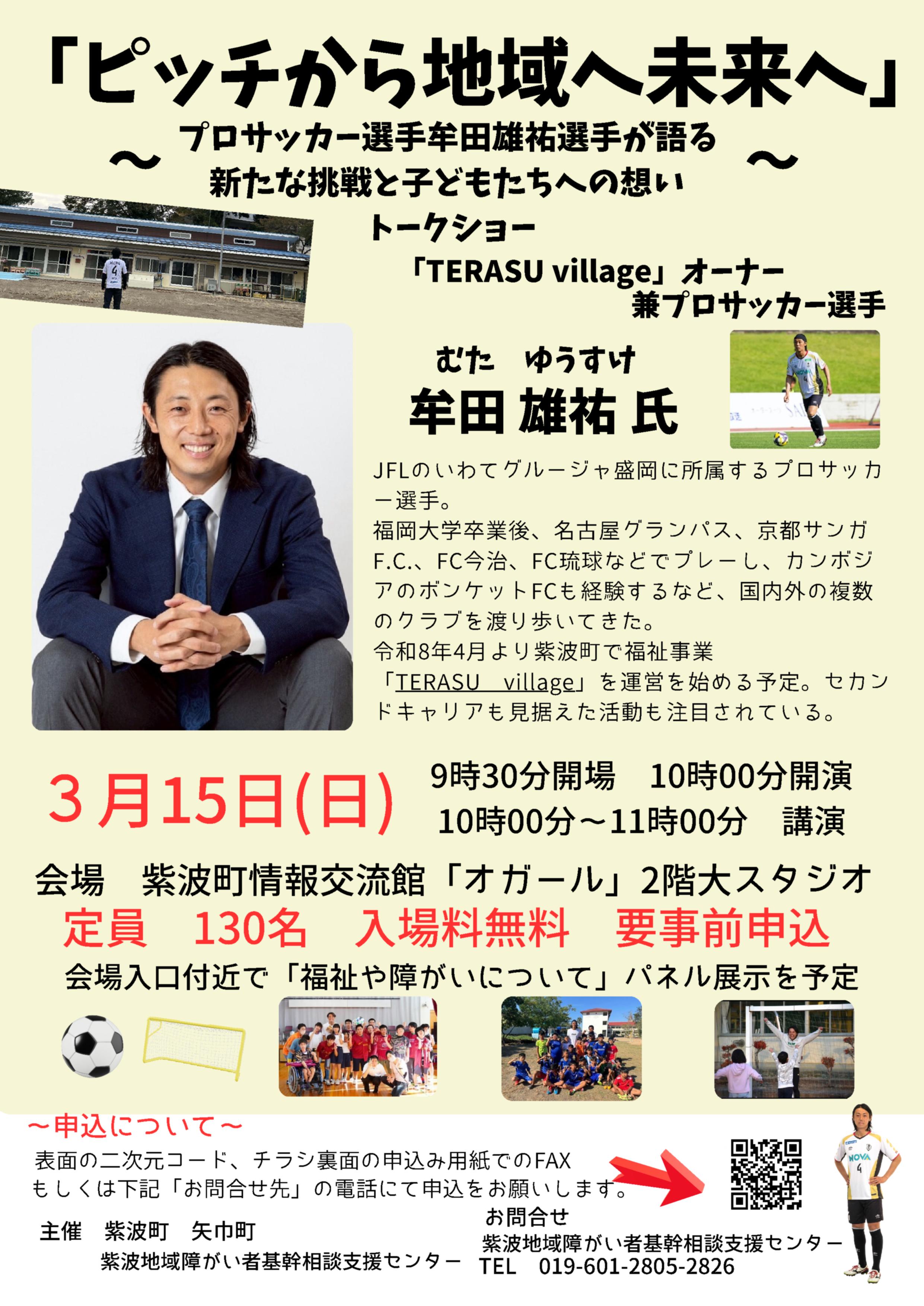 内容は、「ピッチから地域へ未来へ」~プロサッカー選手牟田選手が語る新たな挑戦と子どもたちへの想い~