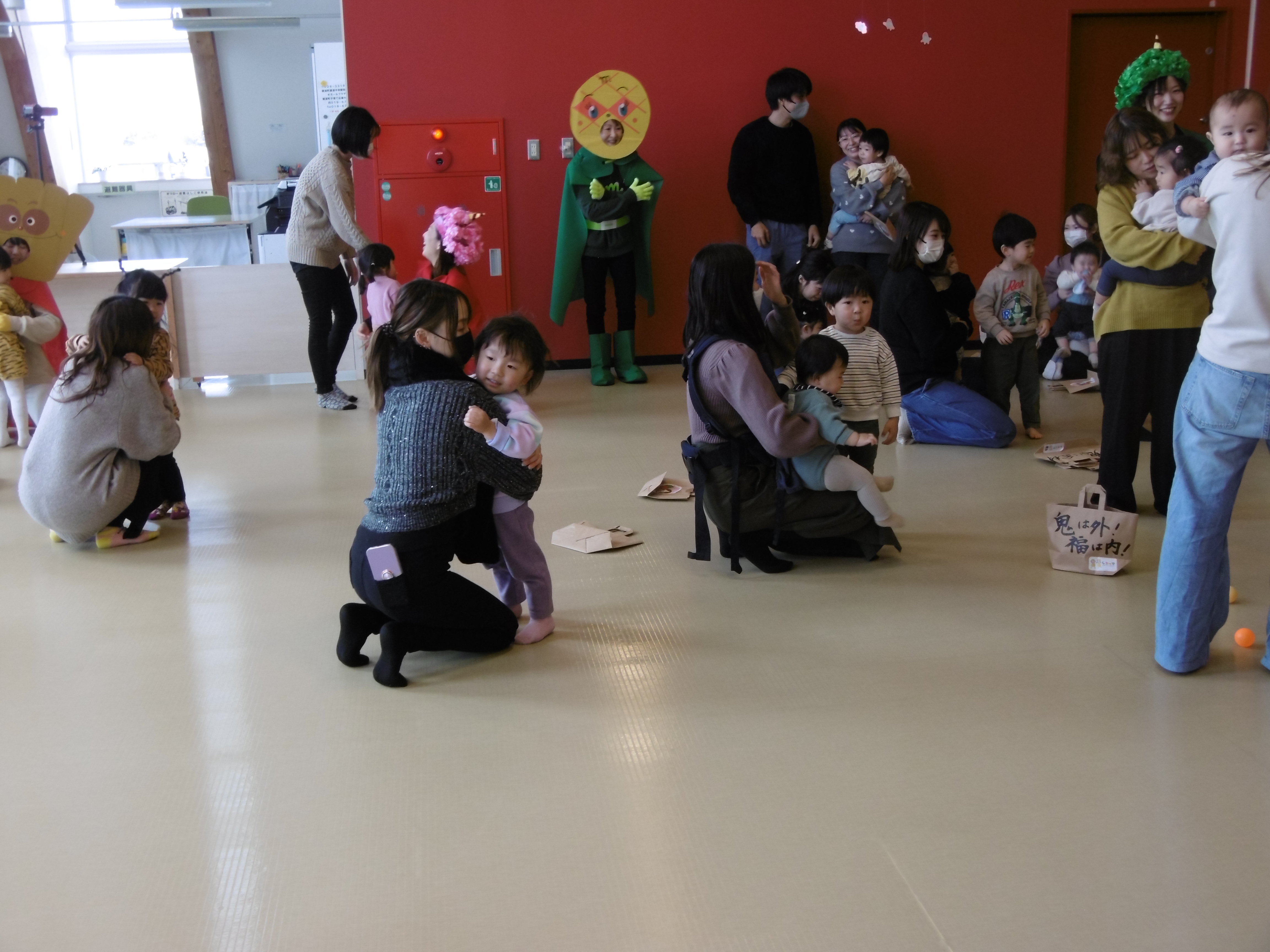 豆まきあそびでは、職員が投げた豆を拾いました。新聞紙で作った豆の中には風船と当たりくじが!見事当たりくじが入っていた子には鬼バージョンのアンパンマンのキャラクターのお面をプレゼントしました✨