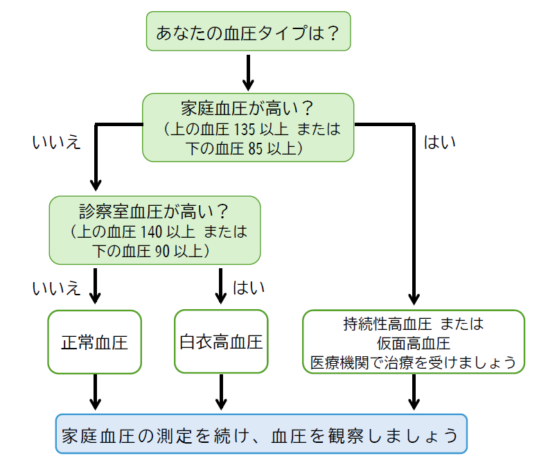 家庭血圧が正常でも、緊張などで診察室や健康診査の会場で血圧が高くなってしまう白衣高血圧は、今のとこ ろ問題ありませんが、将来、持続性高血圧を発症する危険性もあります。