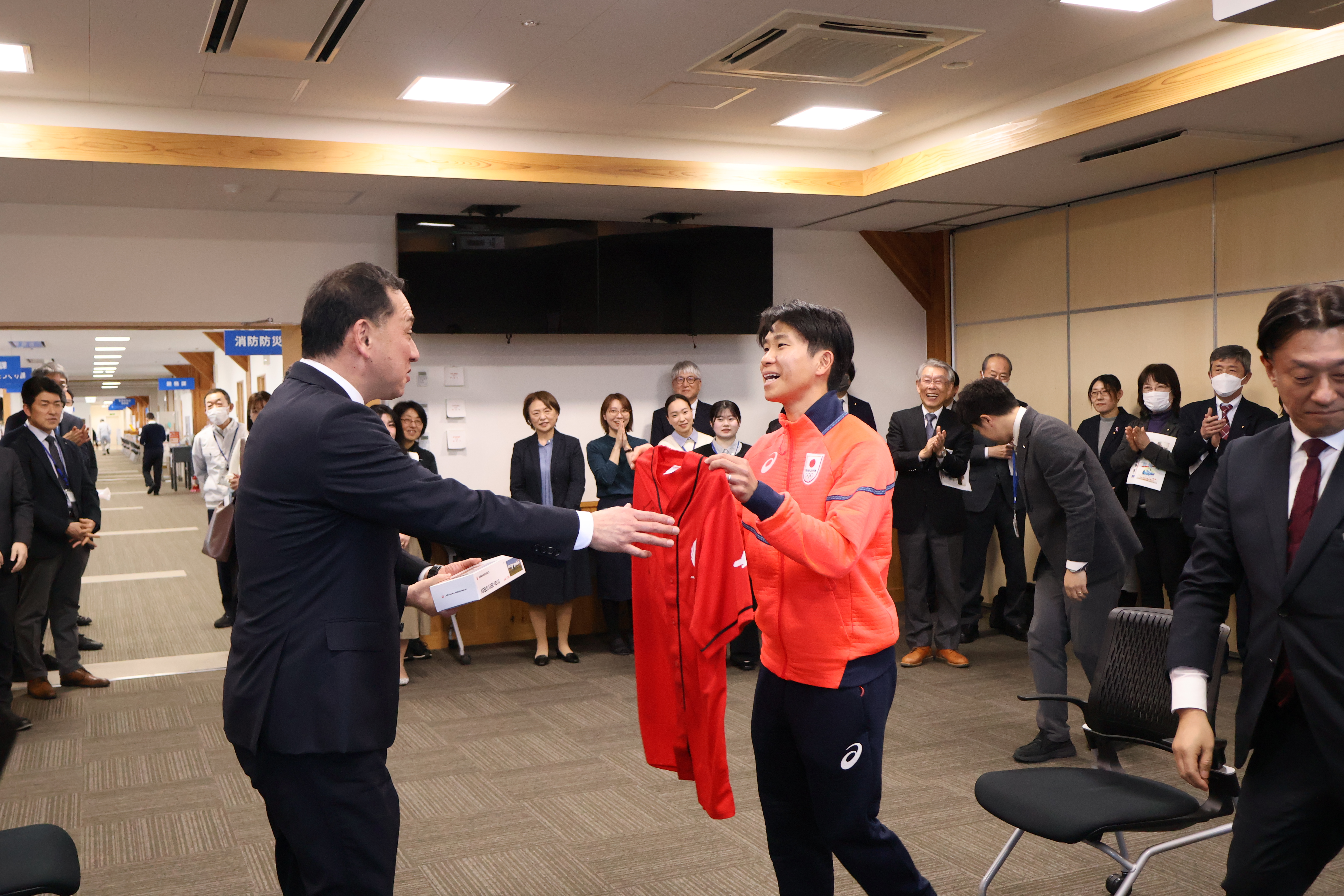 大会報告会開始後に町から花束が贈呈されると、谷地選手は満面の笑みに。オリンピックの報告や今後の抱負などをお話しいただく中で、地元ならではのトークも交えながら終始笑顔が溢れる温かい報告会となりました。また、報告会の最後には、谷地選手から町へ「サイン入りシャツ」と「サイン入りJAL飛行機の模型」がプレゼントされ、突然の出来事に会場内は驚きの声と感激の拍手に包まれました。