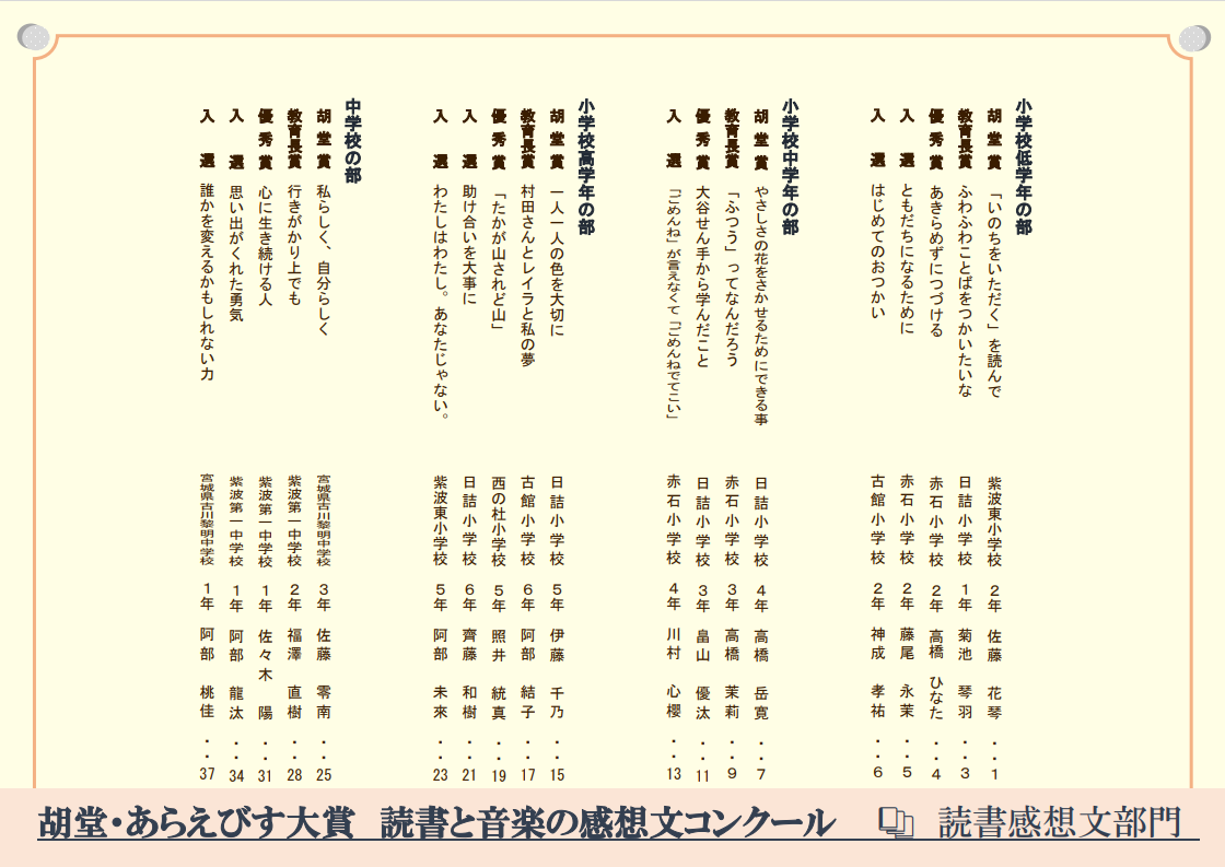 紫波町の名誉町民である野村胡堂・あらえびすの功績を称え、より多くの人に読書と音楽に親しんでほしいという願いで始まった「読書と音楽の感想文コンクール」。11回目となった今年度は、135点の応募がありました。その中から、審査員が厳選した作品28点を文集としてまとめました。また、読書推進を目的として行われている、 わたしの「おすすめ本」POPコンクールの今年度入賞作品もあわせて掲載しますので、ぜひご覧ください。